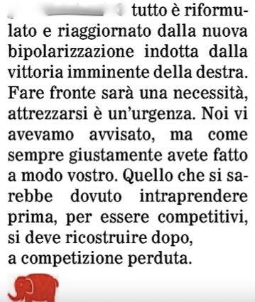 Ora purtroppo, secondo il quadro dipinto dallo stesso Ferrara non più tardi di ieri, e condiviso su Domani anche da Curzio Maltese, sempre ieri, non resterebbe che rassegnarsi e prepararsi ad un’avveduta gestione della sconfitta. “Appello al centrosinistra per un futuro decente di battaglie comuni”, ha titolato Il Foglio con questa conclusione dell’elefantino rosso: “Quello che si sarebbe dovuto intraprendere prima, per essere competitivi, si deve ricostruire dopo, a competizione perduta”.
