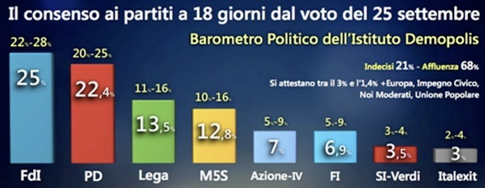 Pare dunque che ad Arcore e dintorni, più ancora di quella grande nube nera levatasi sulla Lombardia per un incendio, vista d’altronde da quelle parti più in televisione che ad occhio nudo perché fortunatamente distante, abbia creato un certo panico un sondaggio elettorale di Demopolis condotto per il salotto televisivo di Lilli Gruber, su la 7. Un sondaggio peraltro che rischia di essere ricordato più a lungo del solito perché da dopodomani- 10 settembre- non se ne potranno pubblicare altri, troppo vicini al 25, il giorno del voto.