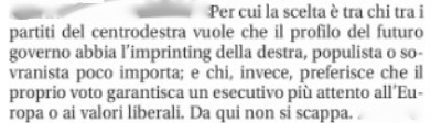 E’ valsa poco la consolazione della distanza ormai incolmabile fra il centrodestra e la coalizione rimasta nelle mani di Enrico Letta. Una consolazione modesta rispetto alle dimensioni, all’interno del centrodestra, della crescita di Giorgia Meloni. Che con quel 25 per cento non solo e non tanto ha sorpassato ulteriormente all’esterno il Pd, ma all’interno ha superato di parecchio la somma dei voti della Lega e di Forza Italia. E’ una circostanza che delude un pò la principale aspettativa berlusconiana emersa dagli editoriali del Giornale di famiglia del Cavaliere. Nell’ultimo dei quali, oggi, si legge ancora che “la scelta è tra chi tra i partiti del centrodestra vuole che il profilo del futuro governo abbia l’imprinting della destra, populista o sovranista poco importa, e chi invece preferisce che il proprio voto garantisca un esecutivo più attento all’Europa o ai valori liberali”. “Da qui non si scappa”, ha avvertito il direttore Augusto Minzolini.