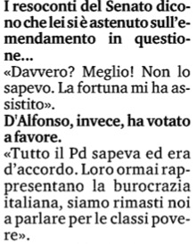 Di questi “funzionari” è ravvisabile, secondo il senatore Perosino, la copertura politica di “tutto il Pd”, che “sapeva ed era d’accordo”, come dalla richiesta originaria di D’Alfonso all’amico forzista di firmare l’emendamento. “Loro ormai rappresentano la burocrazia italiana”, ha detto Perosino parlando dei parlamentari del partito di Enrico Letta e precisando di essersi inconsapevolmente, ma per fortuna, trovato nell’elenco dei risultati delle votazioni fra gli “astenuti”, e non tra i favorevoli del tutto.