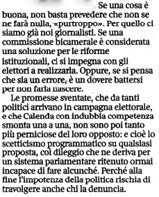 Come si sta facendo con i marchigiani per proteggerli dopo il tributo di morti già pagato in questi giorni alla rivolta della natura contro gli scempi al territorio, si dovrebbe consigliare ai politici in quest’ultima settimana di campagna elettorale di salire nei piani alti per non affogare tra insulti e insensatezze negli scantinati dove sono finiti a furia di scendere.