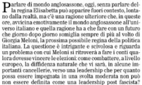Questa situazione, che con minore sintesi non sono purtroppo riuscito a rappresentare, rafforza le ambizioni o aspettative di Giorgia Meloni a 15 giorni dal voto. E allarma naturalmente i suoi avversari, venuti particolarmente allo scoperto oggi sul Fatto Quotidiano con la rivelazione di un certo traffico svoltosi al Quirinale, e al massimo livello, nel mese di agosto. Si è riferito, in particolare di “due vertici segreti” fra Sergio Mattarella e Giorgia Meloni, con Mario Draghi messo sullo sfondo in un malizioso fotomontaggio, per preparare quel “clima unitario” post-elettorale non a caso auspicato negli ultimi giorni da Guido Crosetto. Il quale sta alla Meloni come Silvio Berlusconi si è proposto alla stessa Meloni e a Salvini: un padre rispetto ai figli.