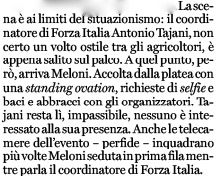 Era proprio Tajani, ieri mattina, a Milano a parlare ai coldiretti all’arrivo della Meloni. Sentite, anzi leggete qui con me la cronaca di Giacomo Salvini sul Fatto Quotidiano: “La scena è ai limiti del situazionismo: il coordinatore di Forza Italia, non certo un volto ostile tra gli agricoltori, è appena salito sul palco. A quel punto però arriva Meloni. Accolta dalla platea con una standing ovation, richieste di selfie e baci e abbracci con gli organizzatori. Tajani resta lì, impassibile, nessuno è interessato alla sua presenza. Anche le telecamere dell’evento, perfide, inquadrano più volte Meloni seduta in prima fila mentre parla il coordinatore di Forza Italia”. Una giornata particolare anche quella di ieri a Milano, come la più celebre del 6 maggio 1938, con Hilter a Roma, raccontata da Ettore Scola nello storico film del 1977.