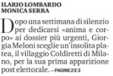 Vi raccomando quel’”anche” che Il Fatto Quotidiano ha voluto aggiungere nel titolo di prima pagina ai “Coldiretti” che ieri a Milano hanno “acclamato” Giorgia Meloni al suo arrivo, da Arcore, dove era stata ricevuta da Silvio Berlusconi, alla manifestazione della potente organizzazione di categoria sopravvissuta intatta, nei suoi valori e capacità organizzative, a tutti i cambiamenti intervenuti nella politica nazionale con la numerazione delle Repubbliche.