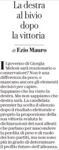 Ezio Mauro, che si era preparato all’evento scommettendo sulla coincidenza fatale del secolo trascorso fra la marcia fascista su Roma e quella elettorale della Meloni, appunto, mi sembra che cominci a vacillare. Stordito, spiazzato e quant’altro pure lui dagli eventi, vedendo la giovane leader della destra italiana arringare coltivatori diretti e nonni anziché energumeni in camicia nera e bastoni nodosi, l’ex direttore di Repubblica si chiede oggi in una corposa analisi politica se il primo governo a guida femminile in Italia sarà “reazionario o conservatore”. Precisando naturalmente che “non è una differenza da poco” e “mancano ancora gli elementi decisivi per capire”. “Sappiamo -ha scritto, e me lo immagino al computer col dito pulsante- che ha vinto la destra, ma non sappiano che destra sarà”. Dal che, al limite, si potrebbe addirittura sperare che ne esista una buona, accettabile, dopo tanto pessimismo sparso a piene mani contro di essa.