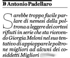 Le tensioni esistenti nel centrodestra, dove peraltro Giorgia Meloni è accusata anche da suoi amici o fratelli di partito di corteggiare troppo tecnici piuttosto che politici per le postazioni di governo più delicate, hanno avuto il loro peso anche nelle difficoltà incontrate dalla candidata a Palazzo Chigi a raccogliere adesioni alle sue offerte più o meno esplicite. Vi ha appena accennato sul Fatto Quotidiano il fondatore ed ex direttore Antonio Padellaro scrivendo: “Sarebbe troppo facile parlare di nemesi della poltrona a leggere dei cortesi rifiuti in serie che sta ricevendo Giorgia Meloni nel suo tentativo di appioppare le poltrone migliori ad alcuni dei cosiddetti “Migliori”, con la maiuscola usata in modo sarcastico da Marco Travaglio quando sbertuccia Draghi e i suoi ministri.