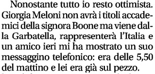 Forse è un pò esagerato quel tre a zero sparato da Libero in prima pagina a favore della Meloni, appunto, sulla Francia della signora Boone. E lo stesso direttore di Libero, Alessandro Sallusti, si è lasciato probabilmente prendere troppo la mano dal patriottismo, se no dal tifo politico, quando ha rivelato la confidenza fattagli da un amico, e provata con tanto di elettronica, che la Meloni già alle ore 5.50 è in piena attività messaggistica di candidata alla guida del governo. Sta “sul pezzo”, ha scritto Sallusti come i giornalisti dicono di se stessi. La Meloni, peraltro, lo è davvero avendo imparato il mestiere al Secolo d’Italia, il quotidiano ufficiale del MoVimento Sociale e partiti indotti.
