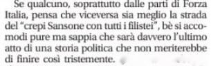 La situazione deve essere apparsa abbastanza compromessa anche ad un amico e sostenitore di Berlusconi come il direttore di Libero Alessandro Sallusti. Che ha scritto nel suo editoriale: “Se qualcuno, soprattutto delle parti di Forza Italia, pensa che viceversa sia meglio la strada del “crepi Sansone con tutti i filistei”, bè si accomodi pure ma sappia che sarà davvero l’ultimo atto di una storia politica che non meriterebbe di finire così tristemente”.