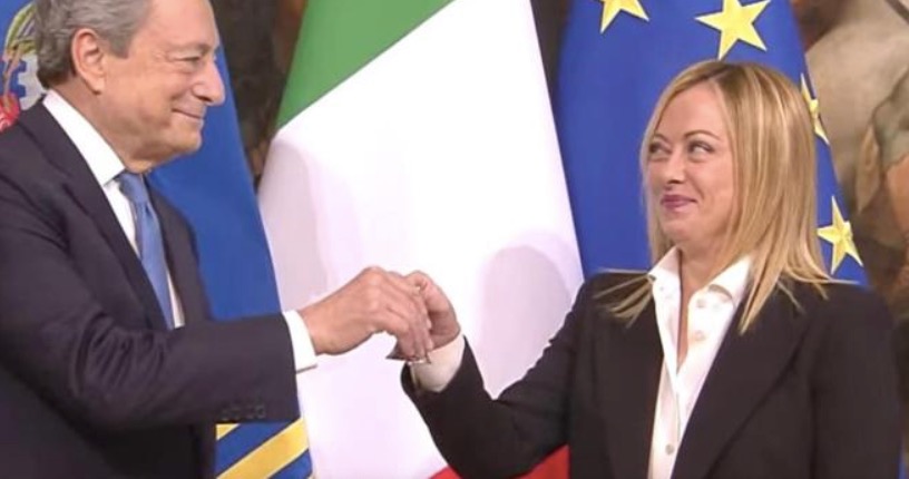 La campanella del Consiglio dei Ministri è dunque passata davvero di mano, e di genere. Mario Draghi, che aveva ricevuto personalmente Giorgia Meloni aspettandola alla fine della scalinata di Palazzo Chigi, percorsa a piedi dall’interessata dopo avere ricevuto nel cortile gli onori militari, l’ha consegnata con aria soddisfatta e sollevata, orgogliosamente consapevole di avere fatto al meglio il suo lavoro con tutti i ministri che lo avevano affiancato. A cominciare naturalmente, ma direi anche significativamente, da Giancarlo Giorgetti, l’unico rimasto nella nuova compagine, e in un ruolo ancora più importante: da ministro dello Sviluppo Economico a ministro dell’Economia e Finanza, in qualche modo sponsorizzato pubblicamente, con dichiarazioni di apprezzamento, dal predecessore Daniele Franco.