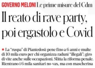 Certamente di destra può essere sommariamente interpretata, con i canoni di certa sinistra, la durezza con la quale il Viminale, diversamente dalla precedente titolare, ha gestito la vicenda del “rave party” a Modena. Che si spera sia stata l’ultima edizione di questo tipo di raduni con licenza di droga e simili.