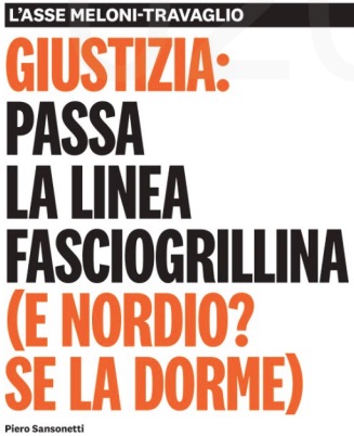 Ma torniamo alla prudenza, tutto sommato, del giornale più vicino a Conte nel registrare e riferire sulle prime misure del nuovo governo. E’ proprio indicando quello che il direttore in persona Piero Sansonetti ha chiamato addirittura “l’asse Meloni-Travaglio”, che un quotidiano orgogliosamente garantista come Il Riformista ha gridato contro il governo: “Giustizia: passa la linea fasciogrillina”. E ha aggiunto, tra parentesi, coinvolgendo nella protesta il nuovo ministro della Giustizia, pur famoso per le sue posizioni generalmente osteggiate dai suoi ex colleghi magistrati d’accusa: “E Nordio? Se la dorme”.