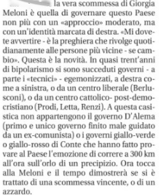 “La vera scommessa di Giorgia Meloni -ha scritto Minzolini- è quella di governare questo Paese non più con un approccio moderato, ma con un’identità marcata di destra.” Mi dovete avvertire- è la preghiera che rivolge quotidianamente alle persone più vicine- se cambio”. Questa è la novità….Il tempo dimostrerà se si è trattato di una scommessa vincente o di un azzardo”. L’attesa non sembra ottimistica.