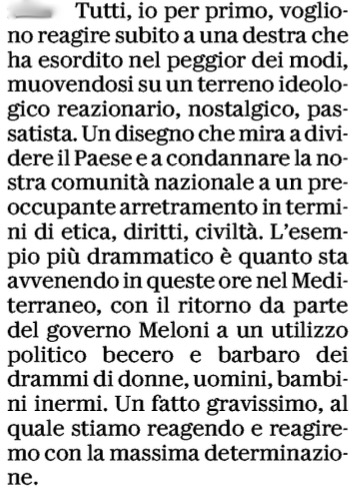 Non è bastato evidentemente a Manconi ciò che lo stesso Enrico Letta aveva scritto il giorno prima proprio su Repubblica in apertura del lungo percorso congressuale di un Pd deciso a “reagire subito a una destra che ha esordito nel peggiore dei modi, muovendosi su un terreno ideologico reazionario, nostalgico, passatista. Un disegno che mira a dividere il Paese e a condannare la nostra comunità nazionale a un preoccupante arretramento in termini di etica, diritti, civiltà”.