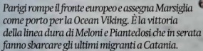 Col volenteroso titolo di Libero a sostegno del governo Meloni coincide sorprendentemente, per la sua identità politica, il giudizio del manifesto. Che sotto il titolo di copertina “Porto franco” ha testualmente pubblicato, nel sommario: “Parigi rompe il fronte europeo e assegna Marsiglia come porto per la Ocean Viking. E’ la vittoria della linea dura di Meloni e Piantedosi che in serata fanno sbarcare gli ultimi migranti a Catania”, quasi come contropartita quindi di quanto strappato a Parigi. Chissà se Giorgia Meloni ha telefonato per ringraziare la direttrice del manifesto Norma Rangeri.