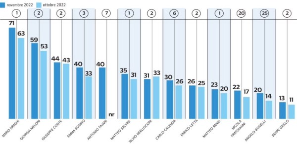 Lasciamo perdere, per brevità e umanità, i dettagli -con le variazioni fra novembre e ottobre- del resto della graduatoria, limitandoci a registrare i più recenti 35 punti di Salvini, 31 di Berlusconi, 30 di Carlo Calenda, 26 di Enrico Letta , 23 di Matteo Renzi e 13 di Beppe Grillo.