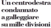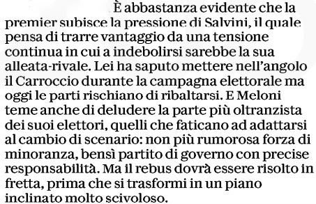 “E’ abbastanza evidente -ha scritto Stefano Folli su Repubblica– che la premier subisce la pressione di Salvini, il quale pensa di trarre vantaggio da una tensione continua in cui a indebolirsi sarebbe la sua alleata-rivale. Lei ha saputo mettere nell’angolo il Carroccio durante la campagna elettorale ma oggi le parti rischiano di ribaltarsi”, avendo la Meloni paura di deludere il proprio elettorato. “Il rebus dovrà essere risolto in fretta, prima che si trasformi in un piano inclinato molto scivoloso”, ha concluso Folli facendo ottimisticamente credere che non siamo giù su quel piano.
