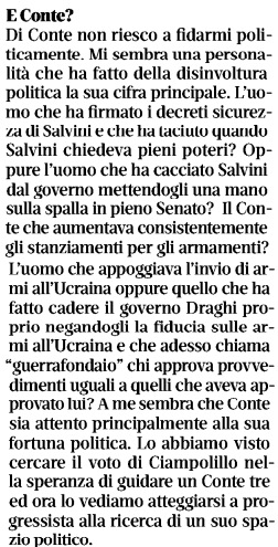 “Di Conte -è finalmente sbottato Zanda parlandone col Riformista, che non voleva sentirsi dire altro- non riesco a fidarmi politicamente. Mi sembra una personalità che ha fatto della disinvoltura politica la sua cifra principale. L’uomo che ha firmato i decreti sicurezza di Salvini e che ha taciuto quando Salvini chiedeva pieni poteri? Oppure l’uomo che ha cacciato Salvini dal governo mettendogli una mano sulla spalla in pieno Senato? Il Conte che aumentava consistentemente gli stanziamenti per gli armamenti? L’uomo che appoggiava l’invio di armi all’Ucraina oppure quello che ha fatto cadere Draghi proprio negandogli la fiducia sulle armi all’Ucraina?…..A me sembra che Conte sia attento principalmente alla sua fortuna politica. Lo abbiamo visto cercare il voto di Ciampolillo nella speranza di guidare un Conte tre e ora lo vediamo atteggiarsi a progressista alla ricerca di un suo spazio politico”. Peraltro, a vedere certe foto giunte ieri proprio da Napoli, scambiando per folle ciò che folle non erano davanti a lui in cappotto, scaldate a mala pena da qualche lampada.