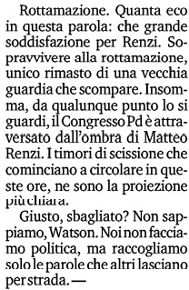 “Rottamazione. Quanta eco in questa parola. Che grande soddisfazione per Renzi”, ha scritto l’Annunziata a proposito del progetto di Bonaccini e Nardella di “smontare e rimontare” il Pd, piuttosto che inseguire a sinistra -come altri preferirebbero- Giuseppe Conte alla testa di quel che è rimasto del movimento grillino nelle elezioni anticipate del 25 settembre scorso. “I timori di scissione che cominciano a circolare in queste ore”, sempre secondo l’Annunziata, “sono la proiezione più chiara” del disastro incombente sul Nazareno. “Giusto, sbagliato ?”, finge di chiedersi l’editorialista, esperta e quant’altro della Stampa invocando Watson e fingendo di garantire che “noi non facciamo politica, ma raccogliamo solo le parole che altri lasciano per strada”.