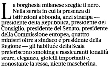 “La borghesia milanese sceglie il nero”, ha scritto sul Corriere della Sera Annachiara Sacchi raccontando che “gli habituèe della Scala preferiscono smoking e rassicuranti tonalità scure”. E “niente mascherina”, ha aggiunto con allusione, non so se volontaria o casuale, alla scarsa popolarità che le difese dal Covid sembrano avere a destra.