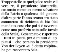 Fra tanta malizia -volontaria o casuale che sia, ripeto- permettetemi di segnalare la pertinenza dello sfondo politico nel quale la cronista di Repubblica Brunella Giovara ha voluto vedere, sentire e raccontare l’ovazione ricevuta da Sergio Mattarella all’arrivo sul palco di cui è “il vero re”, per quante “stelle” possano di volta in volta affiancarsi a lui. Un re “osannato come un eterno salvatore della Patria o qualcosa del genere”. “D’altra parte -ha evocato la Giovara- l’anno scorso egli era stato sommerso di richieste di bis (del mandato, cosa che poi si è avverata come una profezia nata sulle tavole della Scala). Così amato e rispettato -tutti in piedi, per 5 minuti di applausi- che persino la presidente Von der Leyen “si è detta colpita”, ha poi raccontato Sala”, il sindaco di Milano. Che stando sul palco accanto alla capa tedesca della Commissione Europea ha potuto in effetti raccoglierne confidenze e quant’altro.