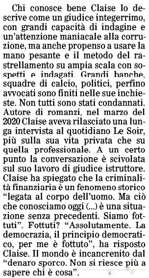 Sentite, sempre nel racconto di Davide Carretta, che cosa Claise diceva nel 2020 parlando non della sua attività di romanziere, giallista e quant’altro ma delle convinzioni sullo stato della democrazia maturate nel suo lavoro di giudice istruttore. La criminalità finanziaria -osservava in una intervista al quotidiano Le Soir– è un fenomeno storico “legato al corpo dell’uomo. Ciò che conosciamo oggi è una situazione senza precedenti. Siano fottuti. Assolutamente. La democrazia, il principio democratico per me è fottuto….dal denaro sporco”, per cui “non si riesce più a sapere chi è cosa”.