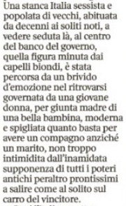 Più che ascoltare e confortare gli sconfitti e i delusi dai risultati elettorali del 25 settembre scorso, Galli della Loggia ha voluto incoraggiare quella “stanca Italia sessista e popolata di vecchi, abituata da decenni ai soliti noti” che “a vedere seduta là, al centro del banco del governo, quella figura minuta dai capelli biondi, è stata percorsa da un brivido d’emozione nel vedersi governata da una giovane donna, per giunta madre di una bella bambina, moderna e spigliata quanto basta per avere un compagno anziché un marito, non troppo intimidita dall’inamidata supponenza di tutti i poteri antichi peraltro prontissimi a salire come al solito sul carro del vincitore”.