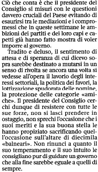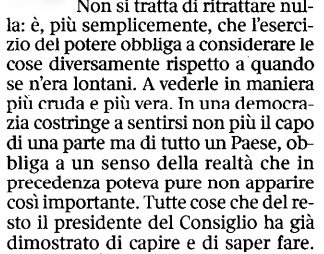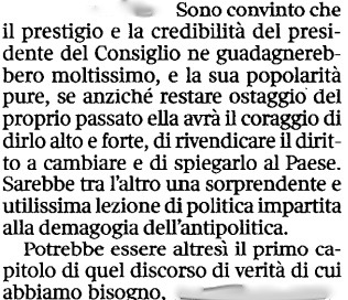 “Sono convinto -ha continuato e al tempo stesso insistito l’editorialista del Corriere- che il presidio e la credibilità del presidente del Consiglio”, al maschile che la Meloni curiosamente preferisce, anche a costo di sminuire la svolta di genere che rappresenta il suo arrivo a Palazzo Chigi- “ne guadagnerebbero moltissimo, e la sua popolarità pure, se anziché restare ostaggio del proprio passato ella avrà il coraggio di dirlo alto e forte, di rivendicare il diritto a cambiare e di spiegarlo al Paese. Sarebbe tra l’altro una sorprendente e utilissima lezione di politica impartita alla demagogia dell’antipolitica”.