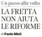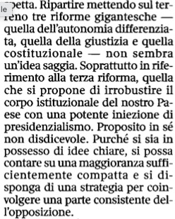 In particolare, la presidente del Consiglio ha messo insieme sul terreno poco saggiamente “tre riforme gigantesche” come quelle “dell’autonomia differenziata, della giustizia e costituzionale”, intesa quest’ultima a “irrobustire il corpo istituzionale del nostro Paese con una potente iniezione di presidenzialismo”. Proposito, quest’ultimo, “in sé non disdicevole”, ha ammesso Mieli, “purché sia sia in possesso di idee chiare, si possa contare su una maggioranza sufficientemente compatta e si disponga di una strategia per coinvolgere una parte consistente dell’opposizione”. Sono condizioni delle quali Mieli dubita, quanto meno, l’esistenza nonostante in tema di tenuta della sua maggioranza la Meloni mostri di considerarla “una falange oplitica”, cioè granitica.