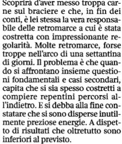 Alla Meloni l’ex direttore del Corriere della Sera ha consigliato di adottare alla guida del governo, a circa due mesi dal suo decollo, il “meglio meno, ma meglio” proposto da Lenin ai compagni, avendo “messo -le ha rimproverato Paolo- troppa carne sul braciere”: tanta da essere stata costretta a “retromarce con impressionante regolarità”.