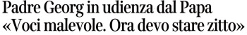 Nel titolo, sempre del Corriere della Sera, apposto alla cronaca si fa dire da padre Georg al Papa in tono, direi, difensivo e pentito: “Voci malevole. Ora devo stare zitto”. Voci malevole alimentate dalle parole dello stesso “Monsignore dimezzato”, com’è stato definito il prelato, purtroppo pubblicate e interpretate “fuori dal contesto”: parola carissima alla buonanima di Leonardo Sciascia.
