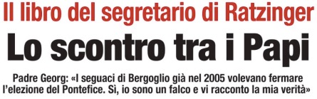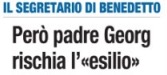 Oggi Libero ha portato quasi in fondo alla prima pagina il seguito dell’affare per avvertire, neppure questa volta aiutando molto il segretario del defunto Papa emerito, che egli “rischia l’esilio”.