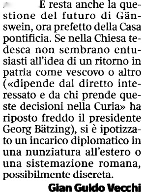 Il vaticanista del Corriere della Sera Gian Guido Vecchi riferisce, dal canto suo: “Resta la questione del futuro di Ganswein, ora prefetto della Casa pontificia. Se nella Chiesa tedesca non sembrano entusiasti all’idea di un ritorno in patria come vescovo o altro, si è ipotizzato un incarico diplomatico in una nunziatura all’estero o una sistemazione romana, possibilmente discreta”.