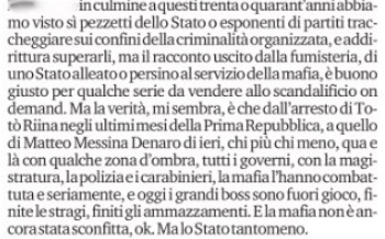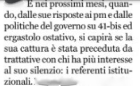 Ai lettori in buona parte grillini che pendono dalle sue riflessioni il direttore del Fatto Quotidiano ha oggi raccomandato di non affrettare sollievi per l’arresto di Denaro perché solo “nei prossimi mesi, dalle sue risposte ai pm e dalle politiche del governo su 41-bis ed ergastolo ostativo, si capirà se la sua cattura è stata preceduta da trattative con chi ha più interesse al suo silenzio: i referenti istituzionali”. Eppure qd altre “trattative” sono stati intitolati processi che dovrebbero fare arrossire, per i loro risultati, inquirenti e cronisti fiancheggiatori.