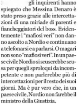 Nel caso ancora fresco della cattura di Denaro Il Fatto ha già indicato chi dovrebbe arrossire, e magari dimettersi o essere rimosso: il guardasigilli Carlo Nordio per il proposito di limitare e disciplinare meglio le intercettazioni. Delle quali evidentemente non si abusa mai abbastanza, visti i miracoli che possono produrre fra tante immondizie.