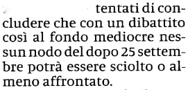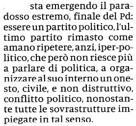 “Con un dibattito così al fondo mediocre” -ha scritto Damilano sotto un titolo in rosso sul “Pd alla ricerca di una bussola”- si è “tentati di concludere…che nessun nodo del dopo 25 settembre potrà essere sciolto o almeno affrontato”. E ancora il cronista ha denunciato “il paradosso estremo, finale: un partito politico, l’ultimo partito rimasto, come amano ripetere, anzi, iper-politico, che però non riesce più a parlare di politica, a organizzare al suo interno un onesto, civile, e non distruttivo, conflitto politico, nonostante tutte le sovrastrutture impiegate in tal senso”.
