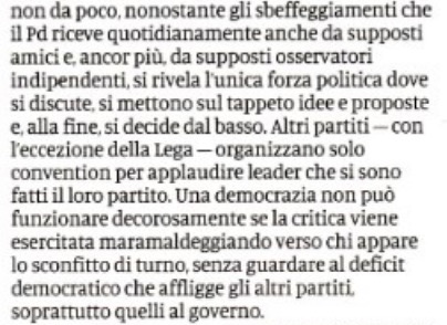 Questa unicità, chiamiamola così, andrebbe riconosciuta “nonostante gli sbeffeggiamenti che (il Pd) riceve quotidianamente anche da supposti amici e, ancor più, da supposti osservatori indipendenti”, ha scritto Ignazi senza riguardi neppure per fondatore, direttore e altri editorialisti e cronisti dello stesso Domani. Il Pd -ha insistito e precisato il professore- è “l’unica forza politica dove si discute, si mettono sul tappeto idee e proposte, e alla fine si decide dal basso”, poco importa se per stare o rimanere all’opposizione o per stare o tornare al governo. Questa, sì, che è serietà: altro che le convention -non congressi- “per applaudire leader che si sono fatti il loro partito”.