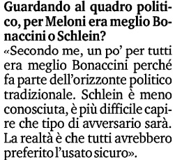 Certo, impressiona che un’estimatrice della Schlein come Michela Murgia l’abbia appena definita sulla Stampa “la donna giusta per noi nel partito sbagliato per lei”, pur aggiungendo che “non si può avere tutto”, per cui “prendiamo il buono”. Ma il buono è un Pd semplicemente spaccato, dove Roberto Gressi sul Corriere della Sera si chiede giustamente se la Schlein sia una “veggente destinata a sfondare o velleitaria pronta a spegnersi”.