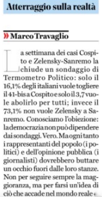 Persino Marco Travaglio sul Fatto Quotidiano, impensierendomi ancora una volta nella condivisione, ha sottolineato un sondaggio dal quale risulta che “solo il 16,1% degli italiani vuole togliere il 41 bis a Cospito e solo il 3,7 vuole abolirlo per tutti”. Pertanto “i rappresentanti del popolo e dell’opinione pubblica”, cioè politici e giornali, dovrebbero ogni tanto buttare un occhio fuori dalle loro stanze….e farsi un’idea di ciò che accade nel mondo reale”. Per i politici c’è il rischio di non essere votati, persino in blocco con l’astensionismo notoriamente crescente, e per i giornalisti il rischio di mandare nelle edicole, che peraltro si riducono sempre più di numero, solo carta per “avvolgere il pesce”, ha scritto ancora Travaglio. Che spesso, in verità, vi contribuisce pure lui montando più l’effimero che il vero, più la monnezza che altro.