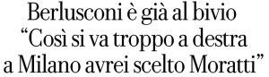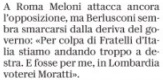 “A Roma -ha raccontato in prima pagina la Repubblica- Meloni attacca ancora l’opposizione, ma Berlusconi sembra smarcarsi dalla deriva del governo. “Per colpa di Fratelli d’Italia -fa dire testualmente al Cavaliere il giornale ora degli eredi dell’avvocato Agnelli- stiamo andando troppo a destra. E fosse per me, in Lombardia voterei Moratti”. Potrebbe davvero farlo, votando lui appunto in Lombardia, non come accadde nel 1993, quando annunciò la sua preferenza per Gianfranco Fini al Campidoglio non potendo però votare a Roma.