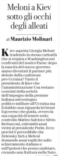 Del caso per niente chiuso si occupa su Repubblica nel suo suo editoriale il direttore Maurizio Molinari in persona sottolineando i problemi di credibilità e quant’altro dell’Italia creati da Berlusconi alla Meloni in procinto della sua vita a Kiev. Dove Zelensky, come potrebbe accadere oltre Oceano quando la Meloni vi andrà, potrà chiederle chiarimenti e garanzie di tenuta dell’Italia sul fronte contrario alle mire espansionistiche di Putin. Un fronte che è diventato per Berlusconi il classico tallone d’Achille: lui, così a lungo fideisticamente europeista e atlantista.