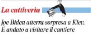 “Biden a Kiev impalla Meloni”, ha annunciato quasi orgogliosamente il solito Fatto Quotidiano, perdonando così al capo della Casa Bianca la colpa rimproveratagli in altra parte della prima pagina, nella “Cattiveria” di giornata, di essere “atterrato a sorpresa a Kiev per visitare il cantiere”: quello non della guerra di Putin all’Ucraina ma dell’Ucraina a Putin commissionato dagli Stati Uniti a Zelensky rifornendolo di soldi e di armi insieme con gli alleati occidentali.