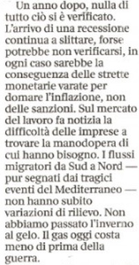 “Un anno fa a quest’epoca l’Occidente -ha ricordato Rampini- cominciava ad applicare le sanzioni economiche contro la Russia. Ne seguì uno psicodramma nazionale sui danni tremendi che ci saremmo auto-inflitti con quelle sanzioni”. Ma “un anno dopo, nulla di tutto ciò si è verificato. L’arrivo di una recessione -ha scritto Rampini- continua a slittare, forse potrebbe non verificarsi, in ogni caso sarebbe la conseguenza delle strette monetarie per domare l’inflazione, non delle sanzioni…..Non abbiamo passato l’inverno al gelo. Il gas oggi costa meno di prima della guerra”.