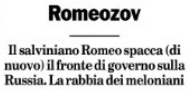 Fuori dall’aula del Senato non si sarà certamente distratto -se non era dentro in qualche tribuna riservata agli ospiti- l’attivissimo ambasciatore russo a Roma Sergej Razov. Che conosca bene i leghisti italiani e il loro capo, cui anticipò i soldi per un viaggio non proprio turistico a Mosca, l’anno scorso, annullato all’ultimo momento. Razov fa rima col nome assegnato al capogruppo della Lega oggi dal Foglio in un titolo di prima pagina a titolo di aggiornamento anagrafico di tipo rigorosamente politico: Romeozov.