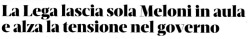 Non è bastata la presenza, a turno, di un ministro leghista organizzata all’ultimo momento dal gruppo del Carroccio a placare sospetti, polemiche, accuse in sede politica e mediatica. “La Lega lascia sola Meloni in aula e alza la tensione nel governo”, ha titolato su tutta la prima pagina Domani, il giornale dell’ingegnere Carlo De Benedetti nella sua ultima versione di “radicalità”, necessaria a rinvigorire un Pd che all’indomani della sconfitta elettorale del 25 settembre gli sembrava ormai perduto, solo da sciogliere e liquidare, per le condizioni alle quali lo aveva ridotto il pur amico Enrico Letta. Che non aveva voluto sentirne i consigli telefonici di non lasciare la porta vuota della sinistra alla destra della Meloni rompendo con i grillini.
