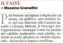 Proprio i grillini, dal canto loro, ieri alla Camera non hanno saputo profittare della “tensione”, vera o presunta, nel governo per prendersi la scena dell’opposizione, vista anche la rinuncia della nuova segretaria del Pd ad intervenire nella discussione. A dispetto dell’enfasi con la quale il solito Fatto Quotidiano ha sparato sulla “faccia di bronzo” gridata personalmente da Giuseppe Conte alla Meloni, l’ex presidente del Consiglio è finito rovinosamente, in aula e sui social, per l’ennesima gaffe oratoria della sua carriera politica. In particolare, egli ha immerso il biscotto del governo di destra-centro nella melma del fascismo all’indomani non del delitto Matteotti ma del “delitto Andreotti”. Che col martire del socialismo italiano fa solo rima.