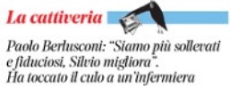 Dalle vignette su di lui, d’altronde, Berlusconi non ha per niente la voglia di privarsi, essendo state in fondo una parte della sua fortuna nei quasi trent’anni di attività politica: specie quelle che scherzano sui suoi incontinenti e largamente condivisi desideri sessuali, come proprio oggi sul Foglio. La cui classe, chiamiamola così, derivata del resto dalla simpatia che in quel giornale nato a suo tempo grazie proprio ai suoi soldi continuano a nutrire per lui anche non condividendone più tutte le scelte politiche; la cui classe, dicevo, riscatta anche la becera “cattiveria” quotidiana di Marco Travaglio. Che esprime la stessa idea attribuendo direttamente e sguaiatamente all’illustre e abituale paziente dell’ospedale milanese San Raffaele una incursione quanto meno manesca sul “culo di un’infermiera”.