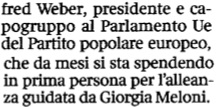 Di Weber, le cui foto assieme a Berlusconi sono ormai d’archivio più che altro, l’’intervistatrice Francesca Basso ha ricordato che “da mesi si sta spendendo in prima persona per l’alleanza guidata da Giorgia Meloni”. Di cui condivide notoriamente il progetto di rovesciare nell’Unione Europea i rapporti di forza e di collaborazione, sostituendo i conservatori ai socialdemocratici nelle scelte preferenziali del Partito Popolare.