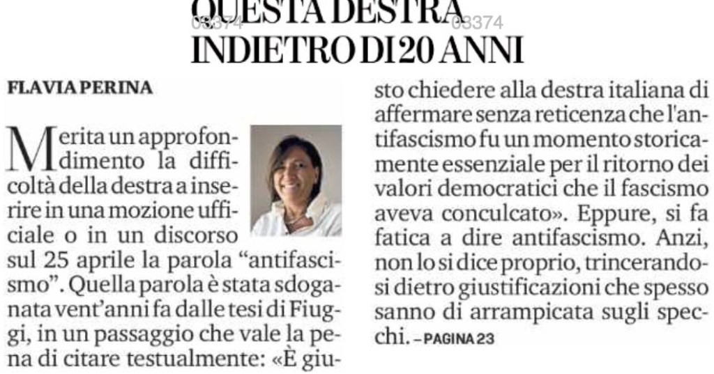 Eppure, prima ancora di vedere e riflettere sulla vignetta di Rolli, il severo e sospettoso Giannini avrebbe potuto rileggersi la prima pagina di ieri del suo stesso giornale. Dove Flavia Perina, già direttrice del Secolo d’Italia, organo ufficiale prima del Movimento Sociale e poi di Alleanza Nazionale, ha riprodotto un passaggio di certo non secondario del documento di svolta della destra italiana approvato a Fiuggi tanti anni fa e che la Meloni non ha mai rinnegato. “E’ giusto chiedere alla destra italiana -diceva e dice quel passaggio- di affermare senza reticenza che l’antifascismo fu un momento storicamente essenziale per il ritorno dei valori democratici che il fascismo aveva conculcato”.