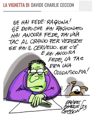 D’altronde, da quelle parti convinzioni molto radicate o fideistiche non sono mai state nutrite, viste le opposte alleanze praticate nella scorsa legislatura. Basta affacciarsi oggi, come ho appena fatto, al blog personale di Beppe Grillo, garante e al tempo stesso consulente retribuito del MoVimento da lui stesso fondato nel 2009, per trovare una vignetta del solito Davide Charlie Ceccon in cui si consiglia, fra l‘altro, a chi ha fede “una tac al cranio per vedere se ha il cervello”. Ma in caso di referto positivo a considerare quella tac come “una colonscopia”.