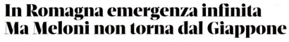 Sabato 20 maggio, perdurando il G7 ma anche il maltempo un pò dappertutto in Italia, sull’Emilia Romagna in modo straordinario, Domani oppone, sempre su tutta la prima pagina, alla “emergenza infinita” la Meloni che “non torna dal Giappone”. E addirittura continua a prevedere nel programma di rientro “una tappa in Kazakistan”. Davvero sfacciata, insolente, disumana questa premier pur così solerte in Giappone a mostrare sul suo telefonino le immagini della propria terra devastata raccogliendo la comprensione, la solidarietà e la disponibilità ad ogni possibile aiuto dagli altri “Grandi”, con la maiuscola.